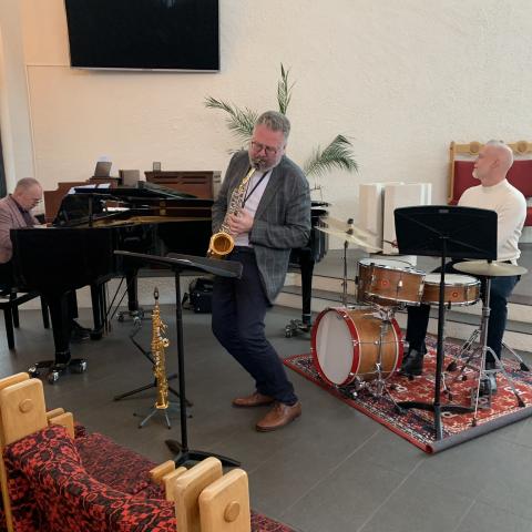 Sigurður Flosason, Einar Scheving og Jónas Þórir djössuðu sálmana í mikilli sveiflu á fyrstu hádegistónleikum Bleiks október í Bústaðakirkju, miðvikudaginn 3. október.