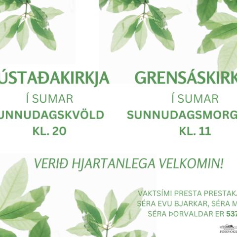 Messur eru í Grensáskirkju á sunnudagsmorgnum kl. 11 fram í miðjan júlí en kirkjan er lokuð vegna sumarleyfa frá 15. júlí til 6. ágúst.