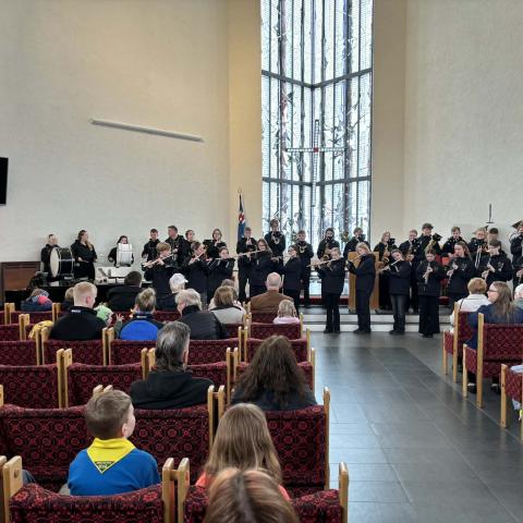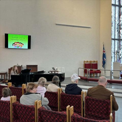 Klukkan 11:30 hóf Skólahljómsveit Austurbæjar dagskrána í Bústaðakirkju með dásamlegum lúðraþyt og tónlist. Þá voru sungin nokkur sunnudagaskólalög. Stundina í kirkjunni leiddu séra Sigríður Kristín Helgadóttir, séra Þorvaldur Víðisson og Sólveig Reynisdóttir leiðtogi. Ásdís Magdalena Þorvaldsdóttir lék á flygil.