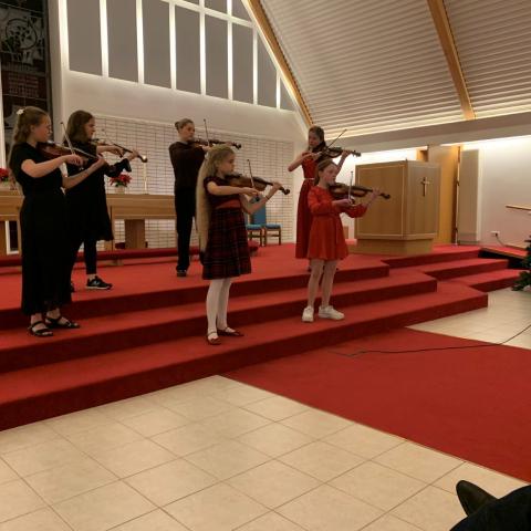 Að loknu upphafsatriði fermingarbarnanna, ljósahelgileiknum, bauð séra María G. Ágústsdóttir alla velkomna til kirkju og kynnti fiðlusveit frá Suzukitónlistarskólanum í Reykjavík. Fiðlusveitin lék dýrðlega fyrir hátíðargesti, jólalög og fleira við undirleik Ástu Haraldsdóttur kantórs kirkjunnar.