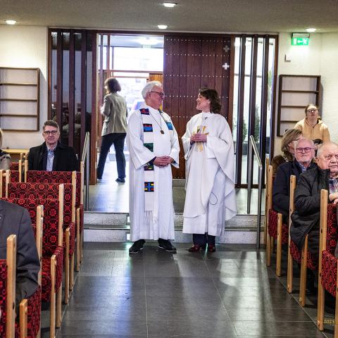 Séra Sigríður Kristín Helgadóttir þjónaði fyrir altari ásamt messuþjónum og eiginkonum Glitnisbræðra. Séra Örn Bárður Jónsson prédikaði. Hér má sjá þau, kollegana, við upphaf helgihaldsins, þar sem fór vel á með þeim.